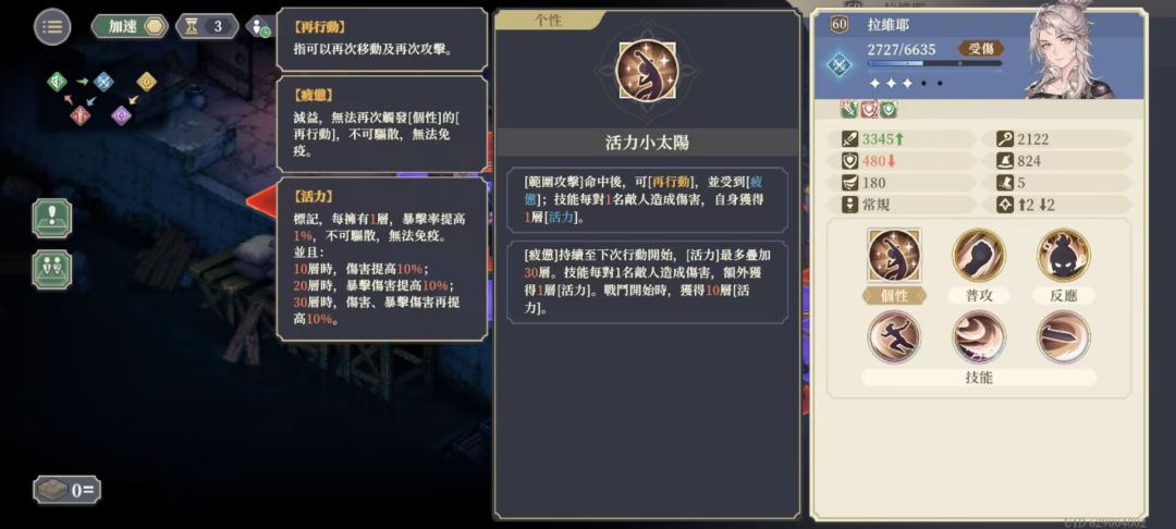 个性活力小太阳没有任何属性加成,范围攻击命中敌人后可再行动,但有疲倦debuff限制,技能美队一名敌人造成伤害,自身获得一层活力,活力叠层能提供双暴和增伤,满星后每个回合没有疲惫的限制,每个回合都可以多次再动,而且通过范围伤害也可以稳定触发,不过也是因为范围伤害比较多,很容易变成对群对策卡