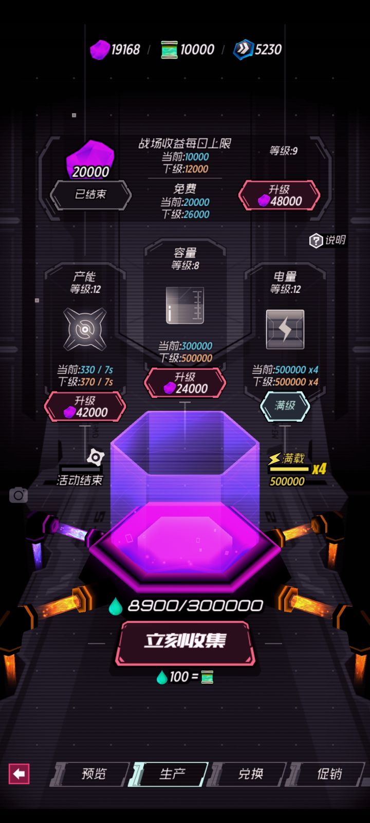 你们怎么都说领取的难啊。前面全点战场收益,然后点一级电量屯着用来加速的时候用。收益9级之后点产能,容量都不需要怎么点。每天也就跑满收益和加速费时一些,也就十来分钟的事。我每天都上线收菜也就两三次的样子,主要还是靠加速,就是费点钻石。剩4天的时候就把奖励领完了啊。