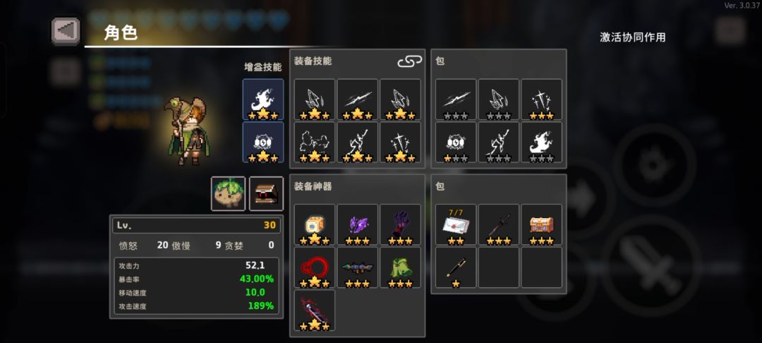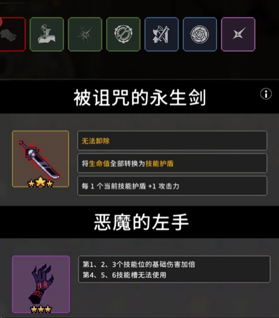 角色默认永远转化血条为技能护盾,永生剑白面为高契合度装备,部分与血条相关装备无效(圣杯,篝火剑等),彩蛋转化的血上限依旧能生效只是不会恢复了,因技能护盾是每收到伤害掉一格的机制,所有对受到伤害增加和减免的圣器也可以随意装备,且因为只能每个房间恢复一个护盾的机制,需尽量避免受伤和控制,唯一的恢复仅有每关恢复一个护盾,上永生剑能立刻恢复所有护盾,无法集齐6神享受恢复所有护盾效果。
