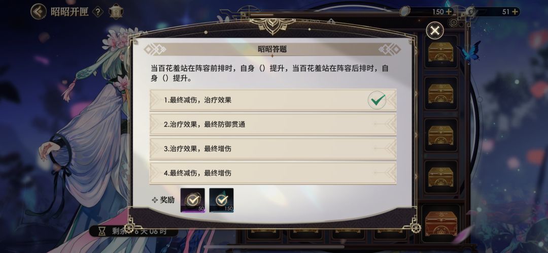 当百花羞站在阵容前排时,自身(1.最终减伤)提升,当百花羞站在阵容后排时,自身(1.治疗效果)提升