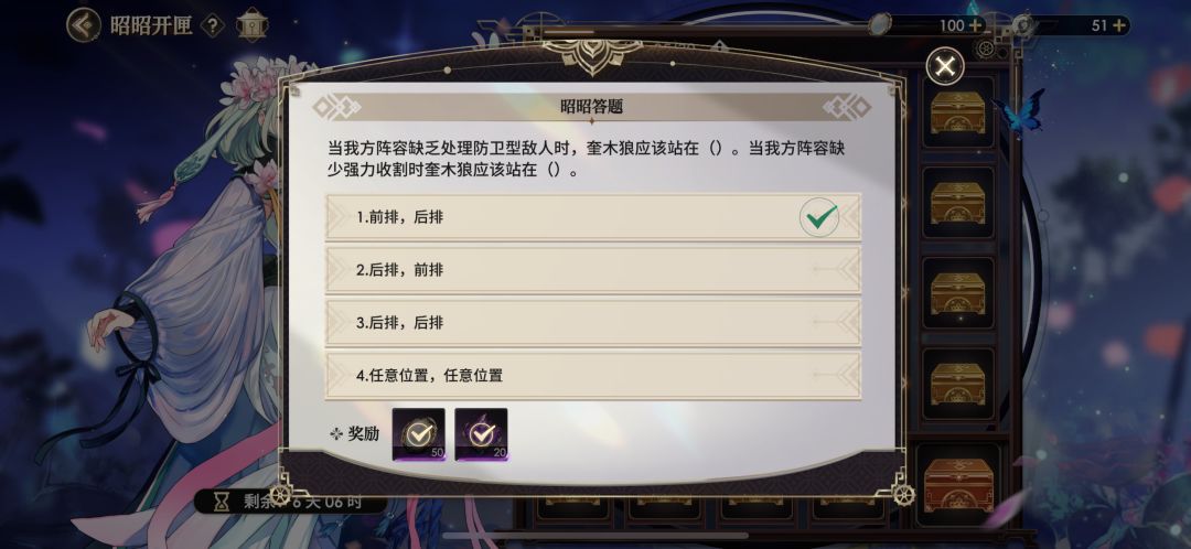 当我方阵容缺乏处理防卫型敌人时,奎木狼应该站在(1.前排),当我方阵容 缺少强力收割时奎木狼应该站在(1.后排)