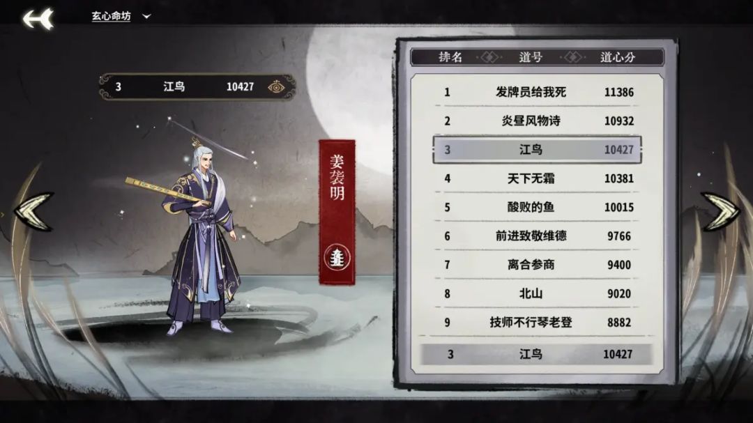 江鸟 玄心命坊版本姜袭明道心10427分,第一届wiki杯亚军,第二届wiki杯个人赛第一名。