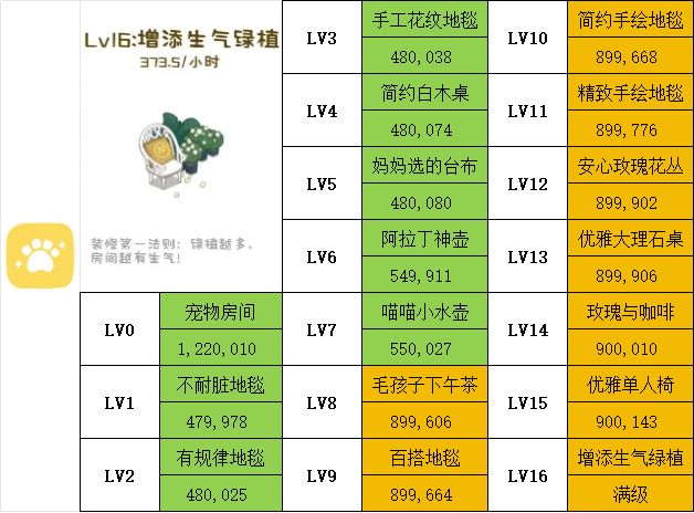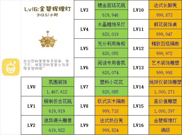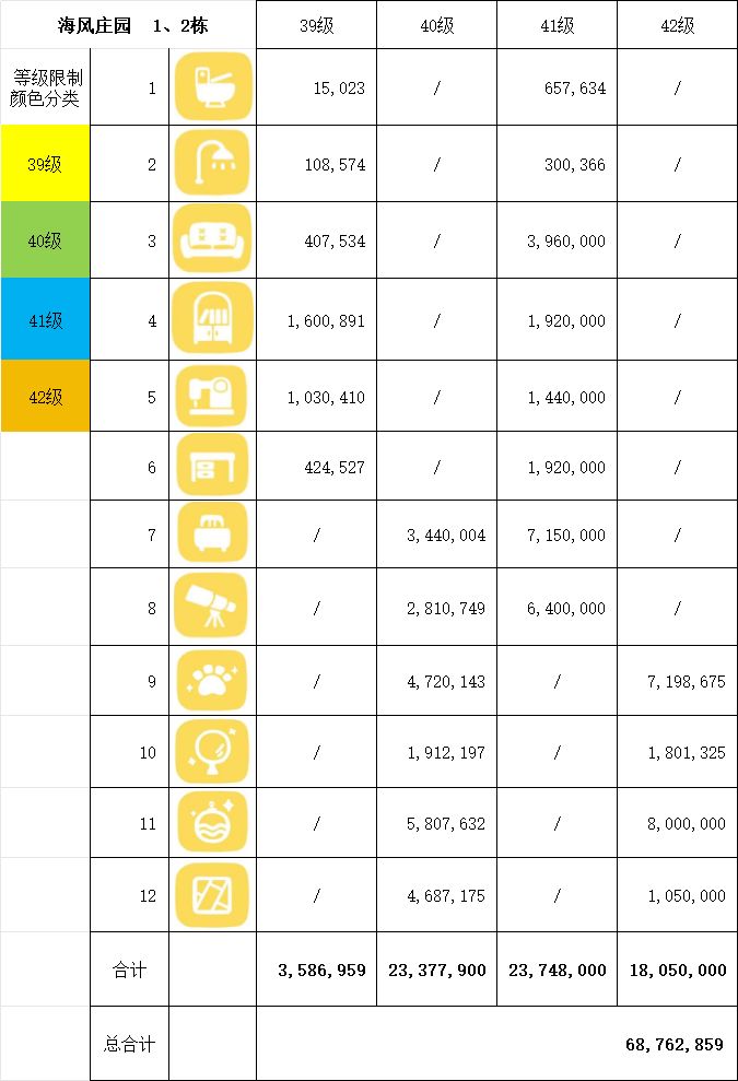 例🌰:在39级时,只能升级第1项—第6项,第一项升级到上限所需总金额为15,023,第二项升级到上限所需总金额为108,574,第三项升级到上限所需总金额为407,534,第四项升级到上限所需总金额为1,600,891,第五项升级到上限所需总金额为1,030,410,第六项升级到上限所需总金额为424,527;最终一间房间升级至上限的总金额为3,586,959。