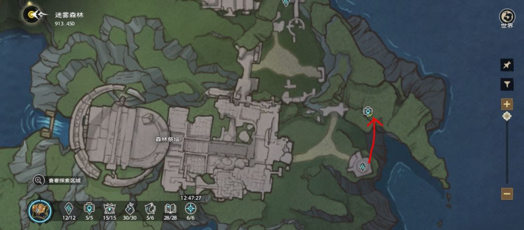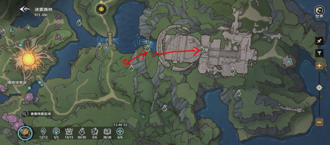 森林祭坛顶上的两个收集不能从正面搭梯子,看红线标记后山起点延伸过去。瀑布顶收集看红线可以一路跳过去不用搭梯子。拍照在传送点延伸到山顶。