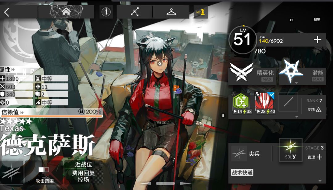 作为前期新手任务赠送的五星尖兵,其做到了集回费,控制,伤害于一身,还有其的天赋 战术快递,可以在编入队伍时开局初始加一点费用(精二加两费)使德克萨斯也拥有满潜模拟器的称号·(因为一般潜能满了之后会减少一到两费)但是,她的缺点前期也特别明显,就是防御力太低,所以在没有精二之前非常任意暴毙,但是前期作为回费档二先锋还是非常合格的,建议萌新优先培养,萌新前期只需要练桃子和她就可以解决前期卡费和怪前期冲家这种问题。