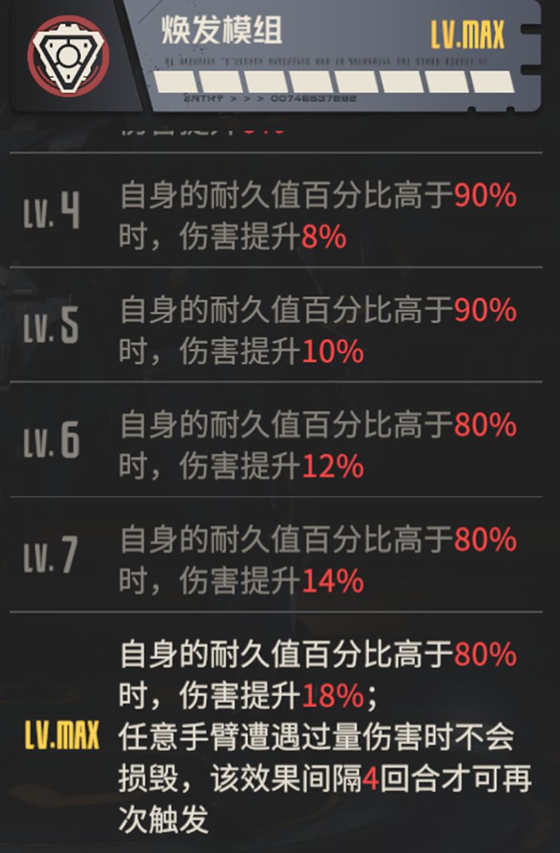 八级模组焕发模组,触发条件为自身耐久高于一定值,相比其他重型机兵的模组,触发条件较为宽松,既不要求“主动攻击”,也不要求“对战中”,这使得游骑兵在多种战斗情况中都能发挥出模组威力。