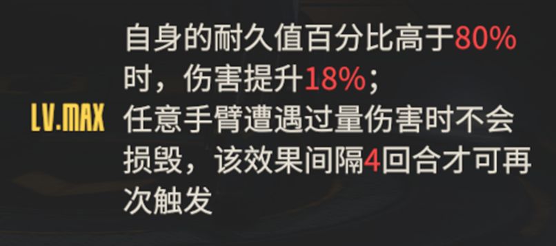 冲锋陷阵中,机兵部位受损在所难免,而往往最容易被破坏的就是手臂,这也是机师们最不希望遇到的情况,因为一旦手臂受损,便无法再拿起武器战斗,只能被动挨打。游骑兵则能够在一定程度上缓解这种困境,焕发模组LV8时,具有手臂保护能力,在手臂遭受过量伤害时不会损毁,这意味着游骑兵即使是在高压战斗下,也能够确保自身不会过早哑火,战场如棋局,有时候能够多造成一次攻击,对战局有不小的影响;在机械师维修不过来的时候,也可以节约队伍机械师一次维修机会,让其他受损的友军及早接受维修。当然,这只能算是中规中矩,毕竟是单次的不会损毁,且有4回合cd,锁定至1点耐久的手臂也容易被其他伤害破坏。