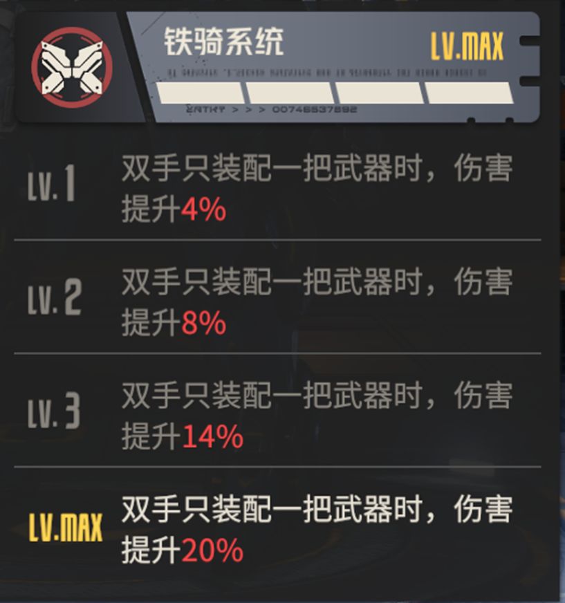 游骑兵的四级模组铁骑系统,触发条件为双手只装配一把武器,相比其他重型机兵模组苛刻的触发条件,铁骑系统能够适配大多数情况,极大的减少了驾驶门槛,大多数机师都能轻松驾驭。