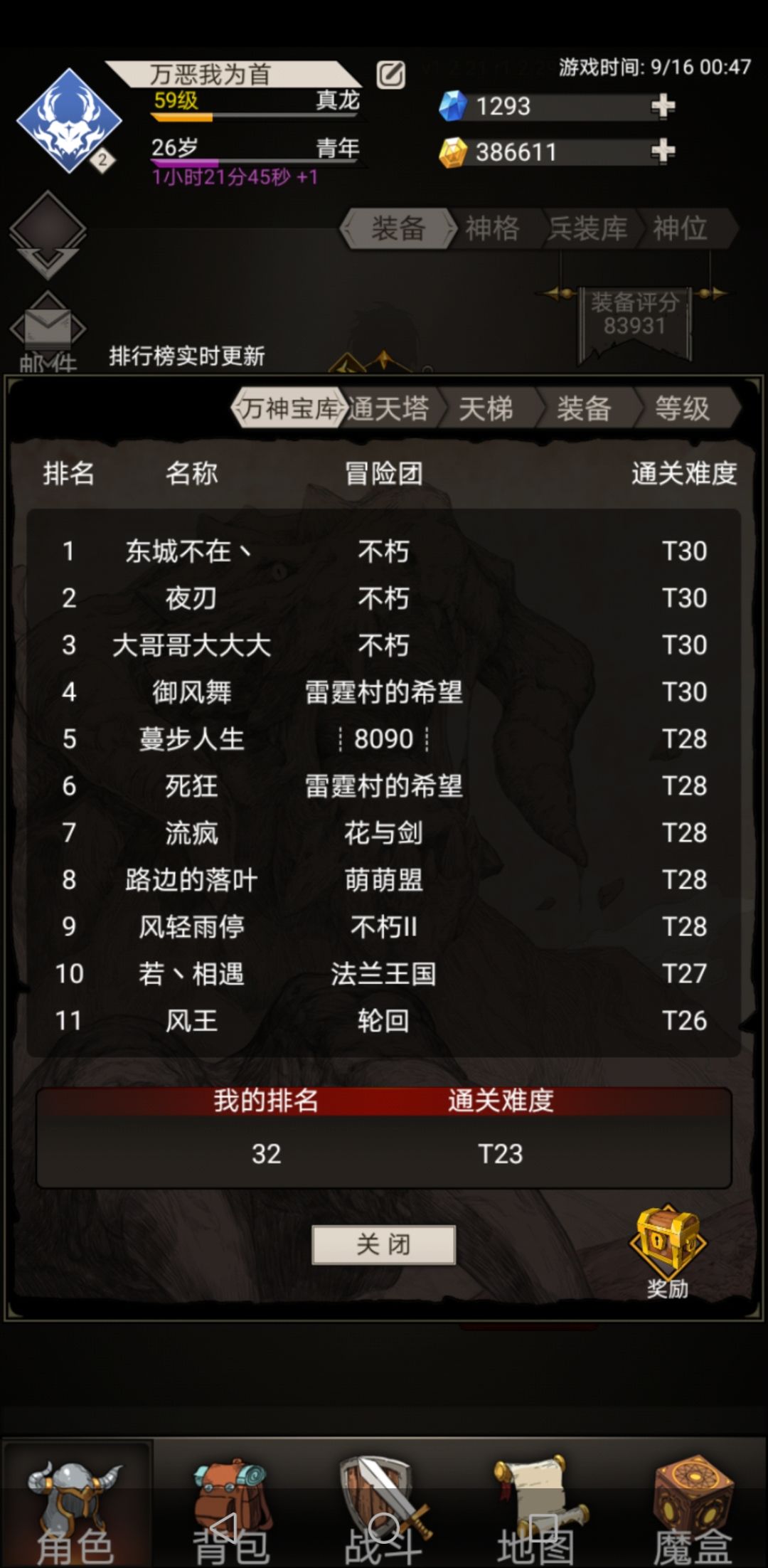 首先自我介绍,万恶我为首,三区,内测氪金600,后续又充了300,幻化等级7级,目前万神T23,排名32名,全身两件+16(其中一件靠维护的资源弄起来的),周围几乎都是氪金几千几万的大佬,全身所有装备+16以上几乎是排行榜前50的标配!所以我的套路不说是最强的,至少还是有一定优势的,就此拿出一些心得跟大家分享