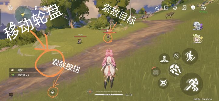 点击索敌按钮会锁定一个目标(黄圈目标),此时你只会攻击你锁定的目标,且你的视角也会锁定在目标身上,你不能控制你的视角(最逆天的
