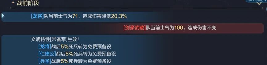 2、战前状态按生效顺序显示依次如下:士气影响、文明特性效果、建筑效果、科技特性效果、城邦特性效果、同类兵种加成效果、时代大厅加成效果、活动加成效果、命运加成效果、头衔特性效果(部分头衔是战时类效果)、装备的兵种自带特性。下面展示一批部分效果的战报截图。