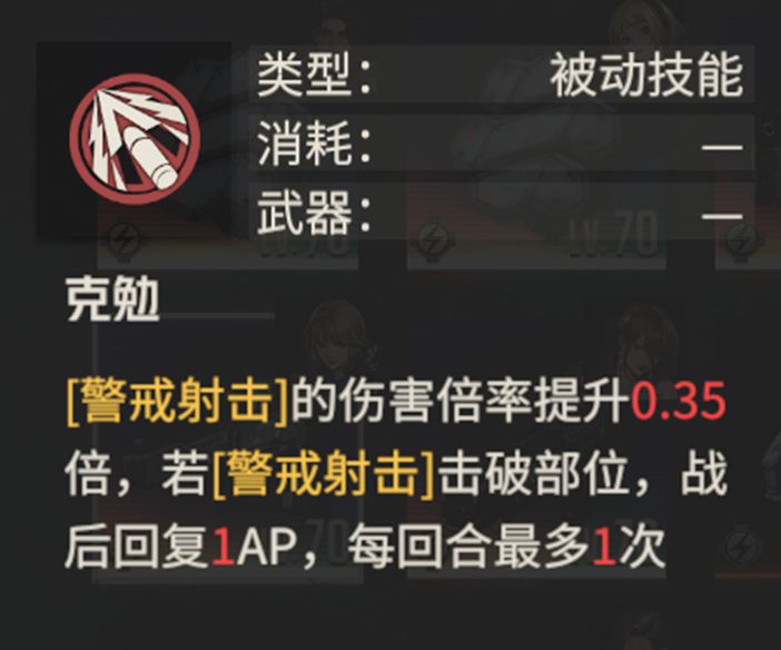 轻型步枪通用技能,提升“警戒射击”伤害倍率,若“警戒射击”能够击破部位,便会回复1ap