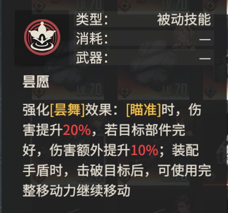 西尔维亚专属技能,强化天赋昙舞效果。昙舞赋予西尔维亚能够在使用轻型步枪主动攻击时进行“瞄准”的能力,对于狙击手职业的西尔维亚来说,这是一个价值极高的机制,攻击时能够瞄准意味着,高额伤害的单发子弹攻击能够准确命中预期部位,那么,就可以做到稳定击破残血部位或是直接消灭敌人,触发再动,无论是垫刀或者收割都有不错的发挥。然而随着游戏进程推进,敌人愈发强大,单纯依靠机制而没有数值的加持,西尔维亚已显乏力。昙愿则对症下药,从数值方面下手,直接赋予西尔维亚“瞄准”时额外的伤害提升,相当于提高了西尔维亚的伤害线,使西尔维亚在面对血量更高的敌人时,依然能够具有破坏部位、收割敌人的能力,缓解面临的问题,维持其灵动垫刀收割手的定位。