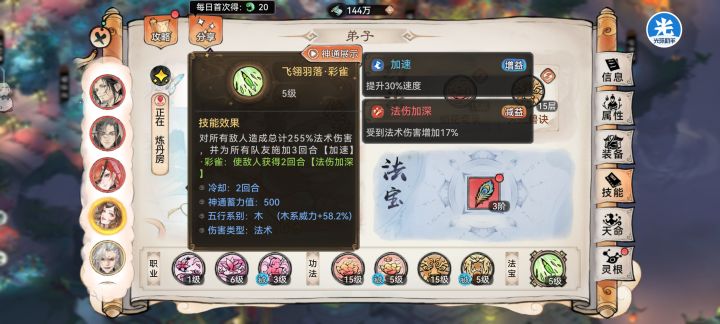 经过多次伤害测试以及功法法宝阵容搭配,输出最为稳定的就是图上的一套。三蛊依靠焰花毒蛇叠加减益buff,法宝立即结算2回合持续伤害并延长一回合持续时间,使得老李的焰花伤害一直存在并且吃满烈阳和无常印的伤害比例加成,使得烈阳伤害直升原来的数十倍!练度高甚至可以一发烈阳带走一切四阶妖兽,成为盟里的帕鲁,大家把你供起来