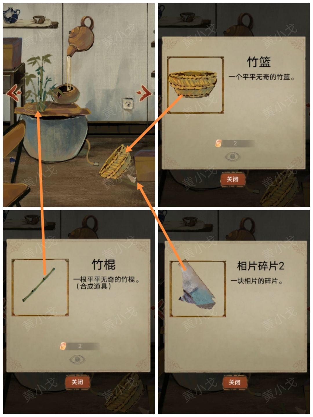 1.(密室-水缸)点击获取水缸上的【竹棍】;地上的【竹篮】和【相片碎片2】