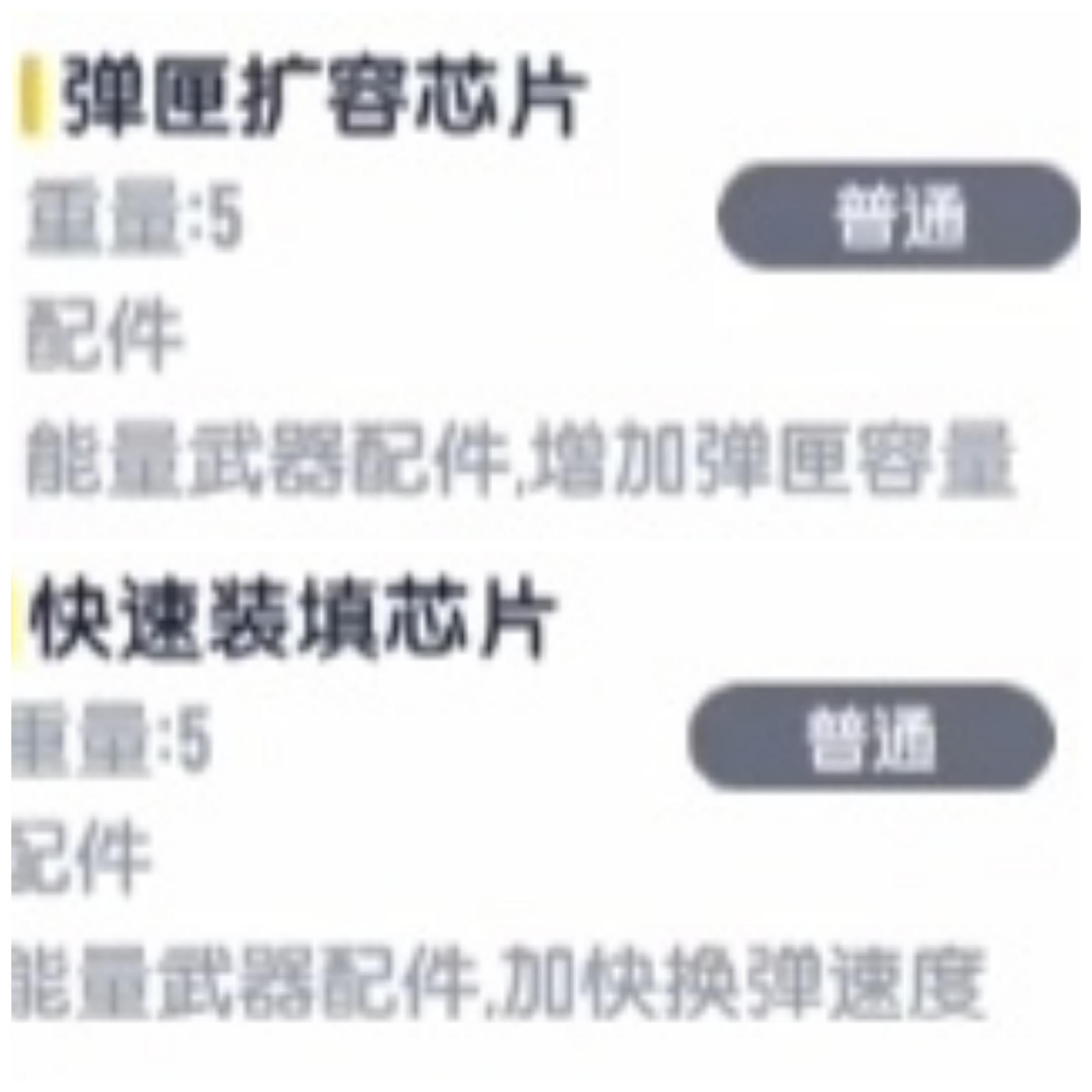 这里列出来一下弹匣槽的两个芯片,扩容+10发子弹,装填+35%换弹速度,个人更推荐扩容一些