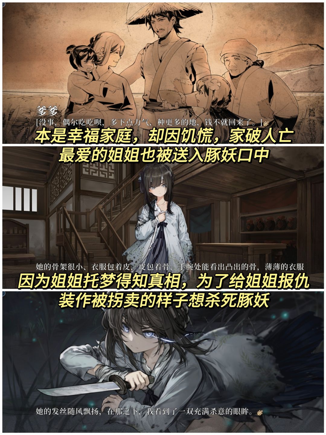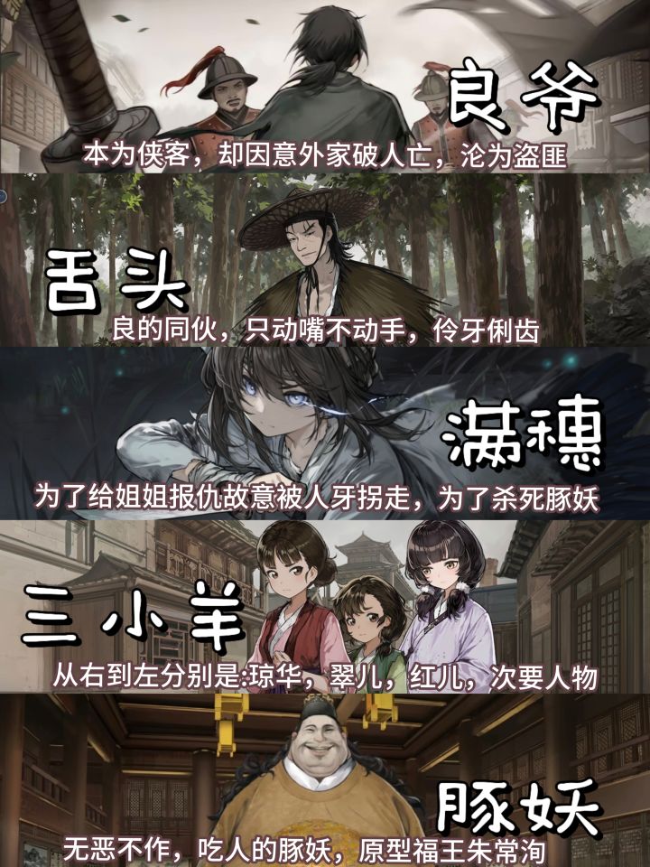🎇女主名为满穗,本有着幸福的家庭却因弟弟的出现以及连年的灾荒家破人亡,最爱的姐姐也被送至了豚妖口中,因此逃离家乡,装作被拐想要杀死豚妖