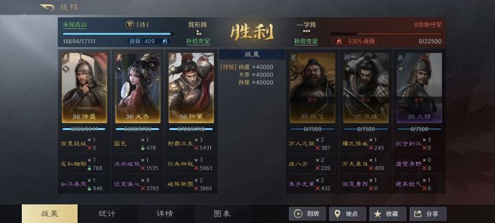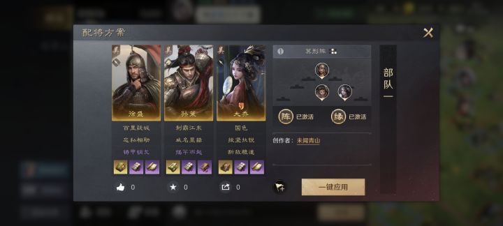 第二种思路则是将大乔换下,携带输出能力更强的武将,但这个思路对战法要求更加严苛,最好是拥有“忘私相助”以及“披坚执锐”的情况下去使用,否则仅凭徐盛,在面对超高兵力的野地时,全队的生存能力将无法得到保障。