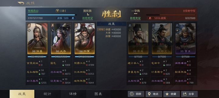 那么笔者由此确认了孙大圣的优化思路,第一种也就是让大乔具备一定的输出能力,选择技能为“断敌粮道”加任意谋略输出型技能如“决水攻城”等,配合孙策携带的战法“斩将夺旗”“揭竿而起”,每回合可以稳定提供110~330倍率的智力伤害,同时断粮效果的存在也能有效降低地方的生命回复。同时为队友搭配“披坚执锐”,“如沐春风”,“忘私相助”等技能,有效提高全队的续航能力。