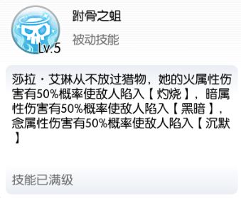 - 第二,被动技能 【附骨之蛆 】的被动效果50%概率还受对方抵抗影响,真实触发几率并没有50%,我试了对雷神一次都不触发(经测试雷神开了【风暴屏障】后视伤害为风属性,导致莎拉的异常不生效),对天使几率触发,20~30%几率吧
