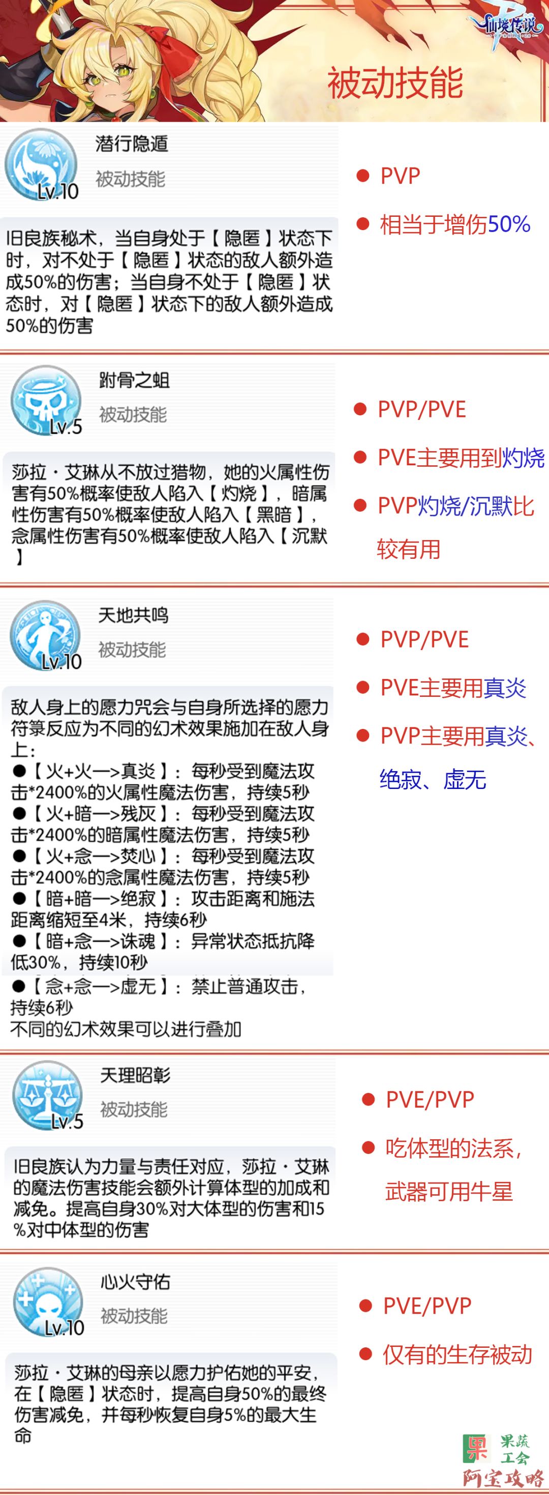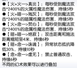 - 【天地共鸣】:提供了艾琳最为特色的幻术效果系统,PVP推荐的是先【念念】、【暗暗】打上控制,然后再【火念】、【火火】进行输出;