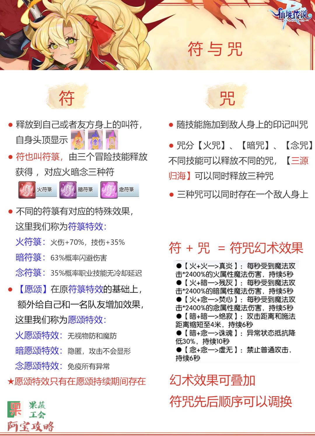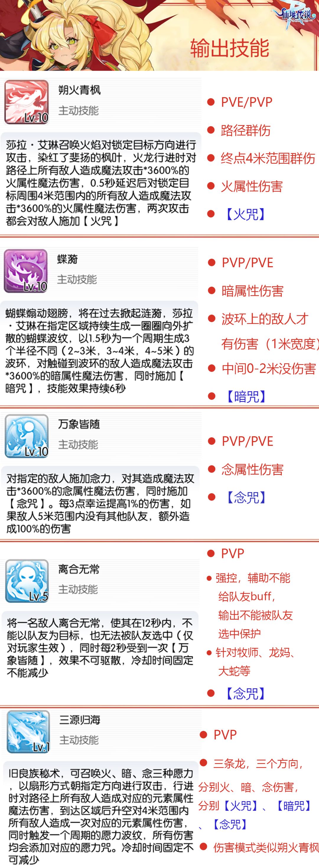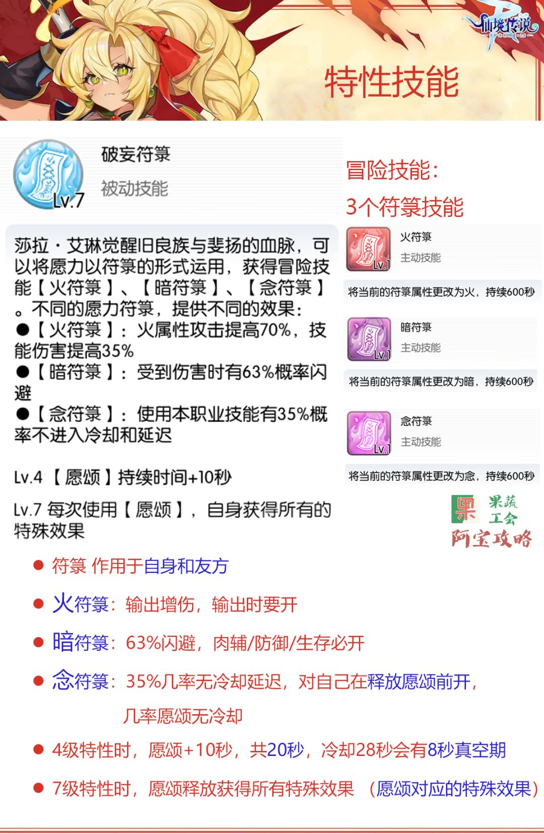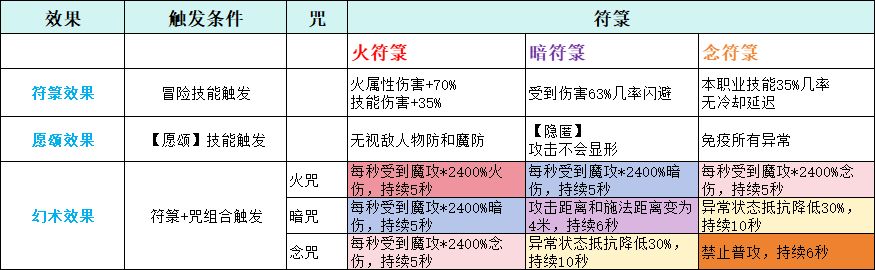 - 艾琳有三个冒险技能【火符箓】【暗符箓】【念符箓】,释放后能够在600秒内让艾琳获得对应属性的符箓(一种状态标识)。