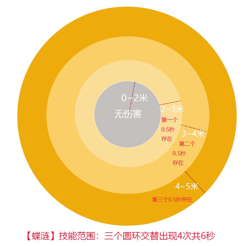 【蝶涟】:以目标点为中心生成3个圆环,每个圆环宽1米,第一个圆环是2~3米范围;第二个圆环是3~4米;第三个圆环是4~5米;三个圆环以0.5秒的间隔相继出现,0~2米的圆范围不受伤害。