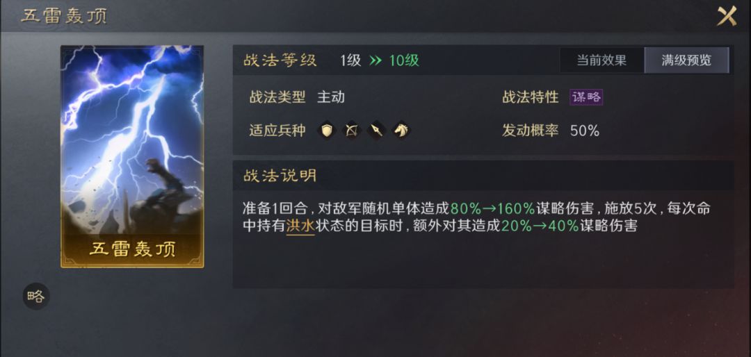 五雷轰顶,与另外一个准备战法奇门遁甲不同的是。此战法释放5次是固定的,在敌方减员后的残局也不会减少伤害,且敌方剩下的武将越少伤害越高,只剩下一名时,5次均会打到一名武将身上,收割能力更强。