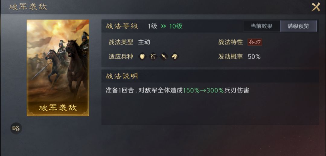 破军袭敌,准备型全体高伤战法,因为一赛季对于准备战法有跳过效果的武将多为谋略型武将,且大多武力型武将的紫色韬略中是没有《先机》韬略的,所以最适合这个战法的是庞德。虽然这个战法为准备战法,但在队伍无其他橙色兵刃主动战法时携带也是可行的。