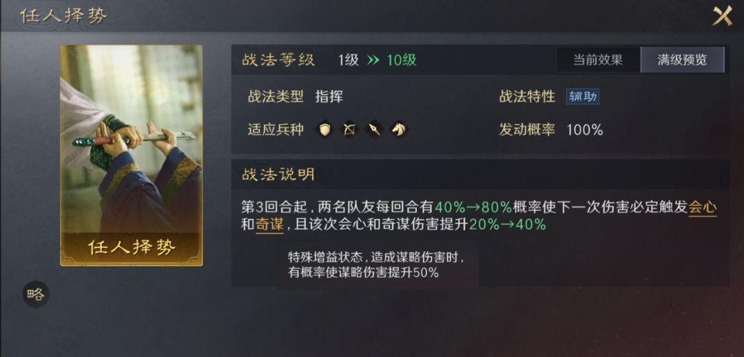 (ps:《太平道法》与《先机》均不可替代,《万全》可使用其他增伤韬略替换,如《鬼谋》、《时利》,也可选择提高主动战法发动率的《励心》,都没有的话也可选择《王道》、《料敌》、《玄机》等增伤韬略过渡)