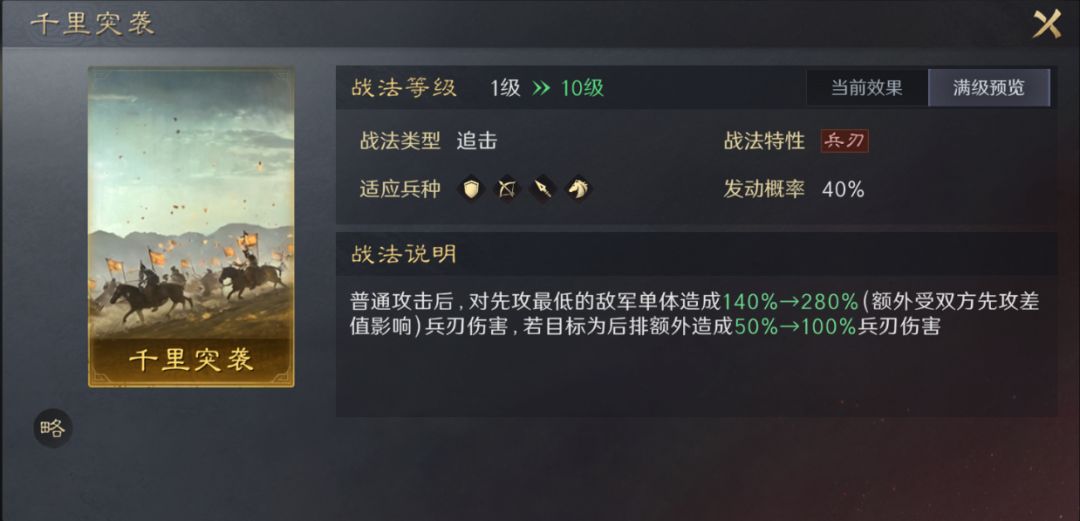 千里突袭,追击战法中伤害较高的单体战法。打的是先攻低且对敌方后排还有额外增伤。但因单追击队伍需要的更多是群体伤害,所以本战法的上场率不算高。但如果组建双追击队伍的话,此战法就是较为重要的单体高攻战法。一些先攻值较高的武将适合搭配此战法,比如夏侯渊、太史慈。黄忠因自带战法有降低敌方武将先攻的效果也可携带此战法。