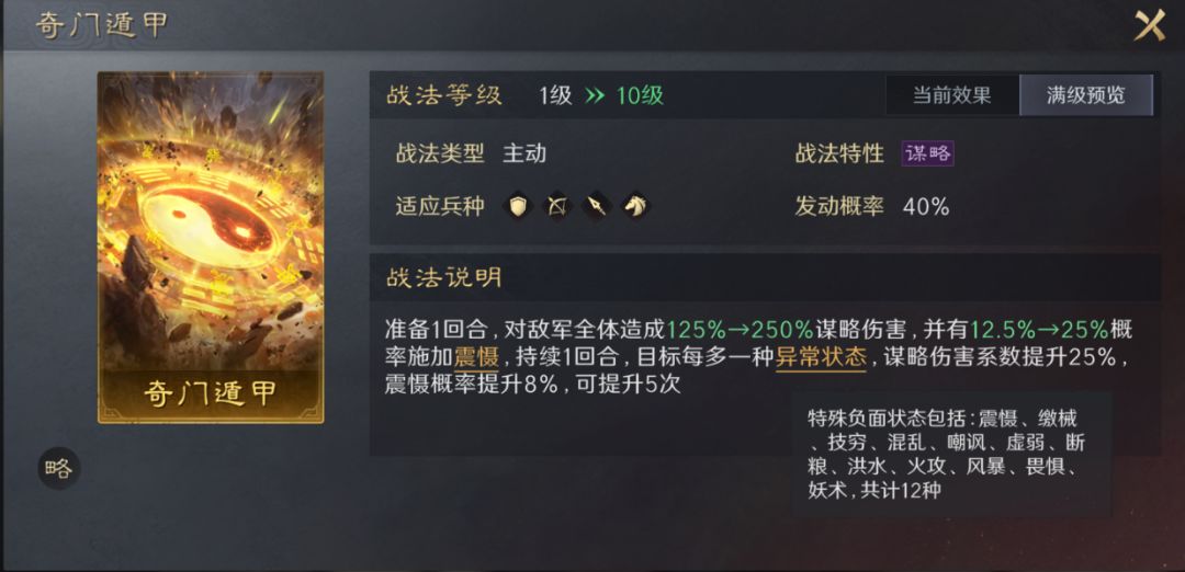 奇门遁甲较为适合的是队里可提供异常状态较多的队伍,只有异常状态较多,奇门遁甲才能打出更高的伤害,且有更高的几率上威慑。比如本卡包里的黄巾队,和本卡包有成员的都督队较为适合此战法。此战法的发动率(40%)较低,阵容中携带此战法的武将可适当考虑韬略中携带《励心》善本,增加一定的主动战法释放率更佳。