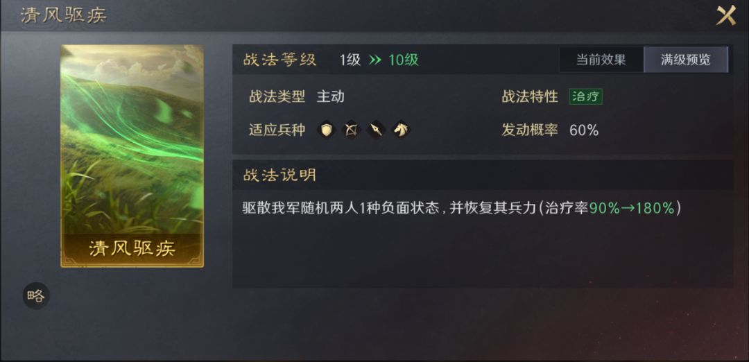 清风驱疾,范围驱散战法,此战法的作用是独一无二的,如果队伍需要一个群体驱散的话,暂时没有完全能替代此战法的替代品。正常情况下适合前排武将有伤害且携带了主动或追击战法,主输出武将也携带的是主动或追击战法,则队伍的副输出或辅助位可选择此战法。