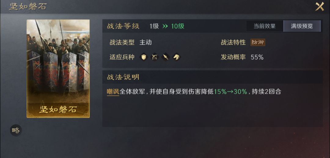 坚如磐石,全体嘲讽战法。主要是前排较肉武将携带,适合赵云、夏侯惇、貂蝉等需要被攻击才能触发自带战法的武将。张梁、黄盖等需要提升自身减伤的前排也可携带此战法。但需要注意的是因为此战法为主动战法,需要队伍辅助提供一定的驱散能力才能保证前排武将的战法更高效触发。
