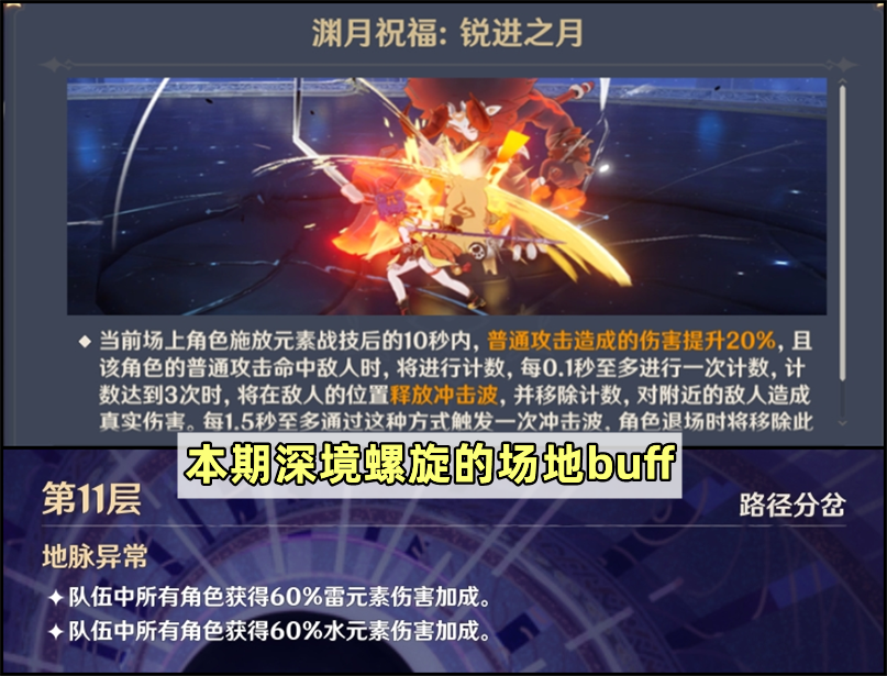 【场地buff】本期渊月祝福为释放战技后,普攻伤害提升;同时普攻累积命中3次后释放冲击波。这个buff最适合以战技起手来强化普攻的角色,比如克洛琳德、莱欧斯利、流浪者、宵宫等等。11层地脉异常则是水/雷元素增伤。