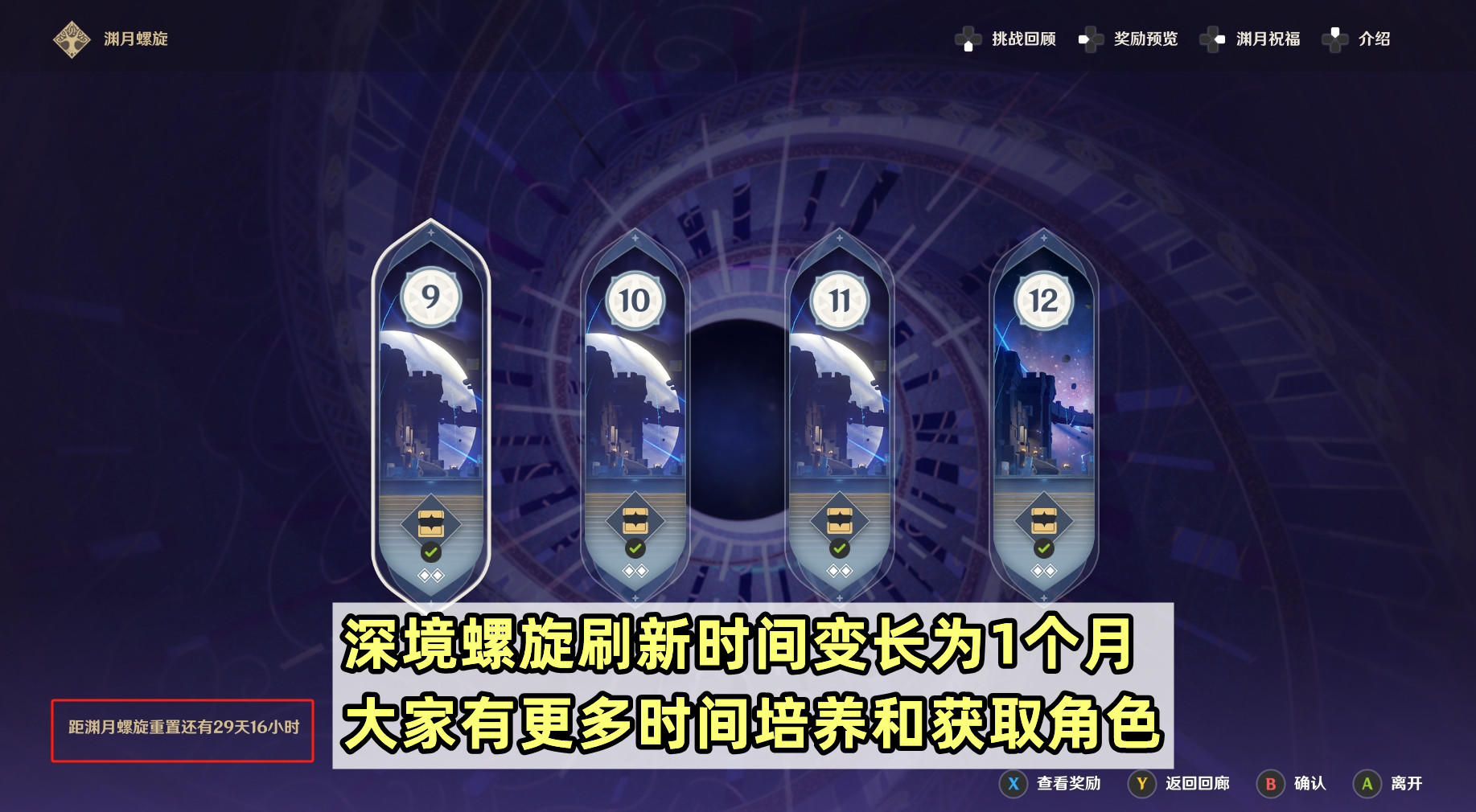 实际体验下来,这期深渊的确有一定难度,除了对练度有要求,像11-1还需要一些技巧去应对。不过从这期开始,深境螺旋的刷新时间变长为一个月,大家也能有更多的时间去培养和获取角色~