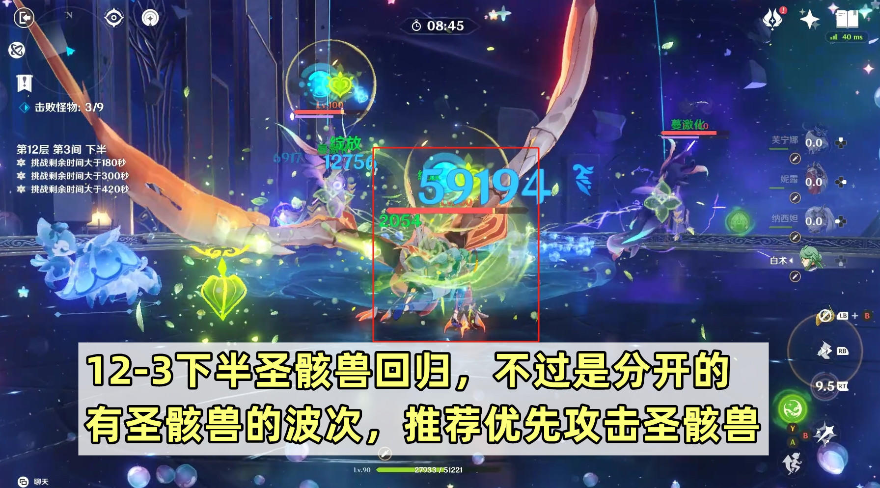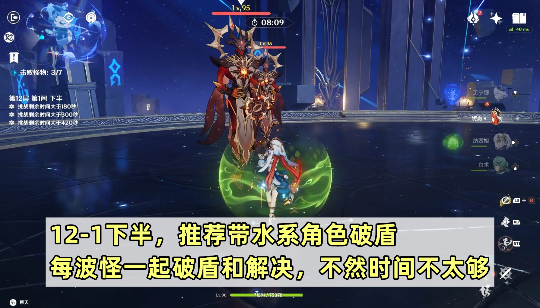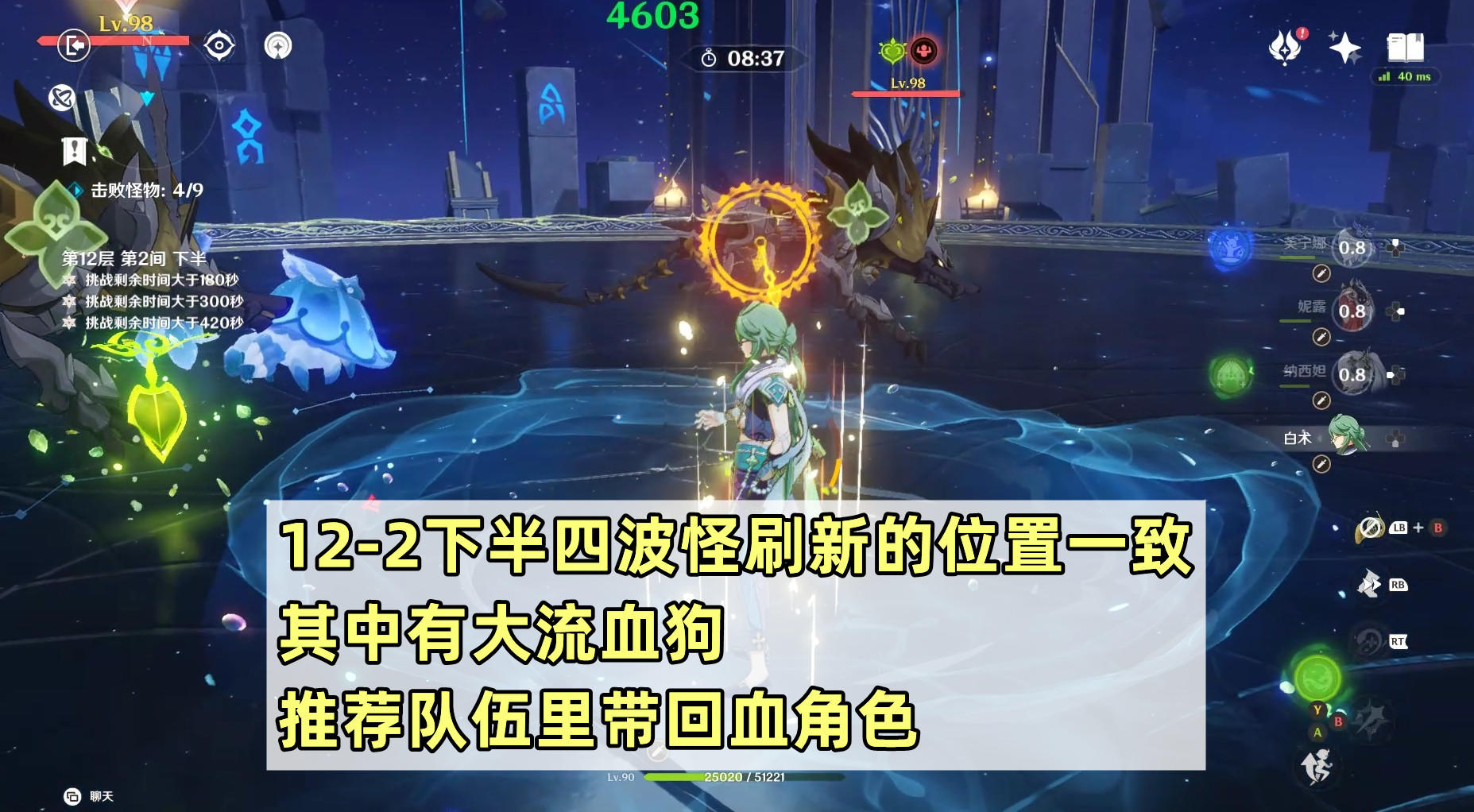 12层下半第一间是本次深渊的难点之一。因为有火深渊法师和火深渊咏者,推荐带水系角色的队伍应对。另外这一间时间会相对紧张,除了上半尽快解决外,下半每波怪刷新的时候,最好是多只怪一起解决,分开打或者破盾时间很可能不够。
