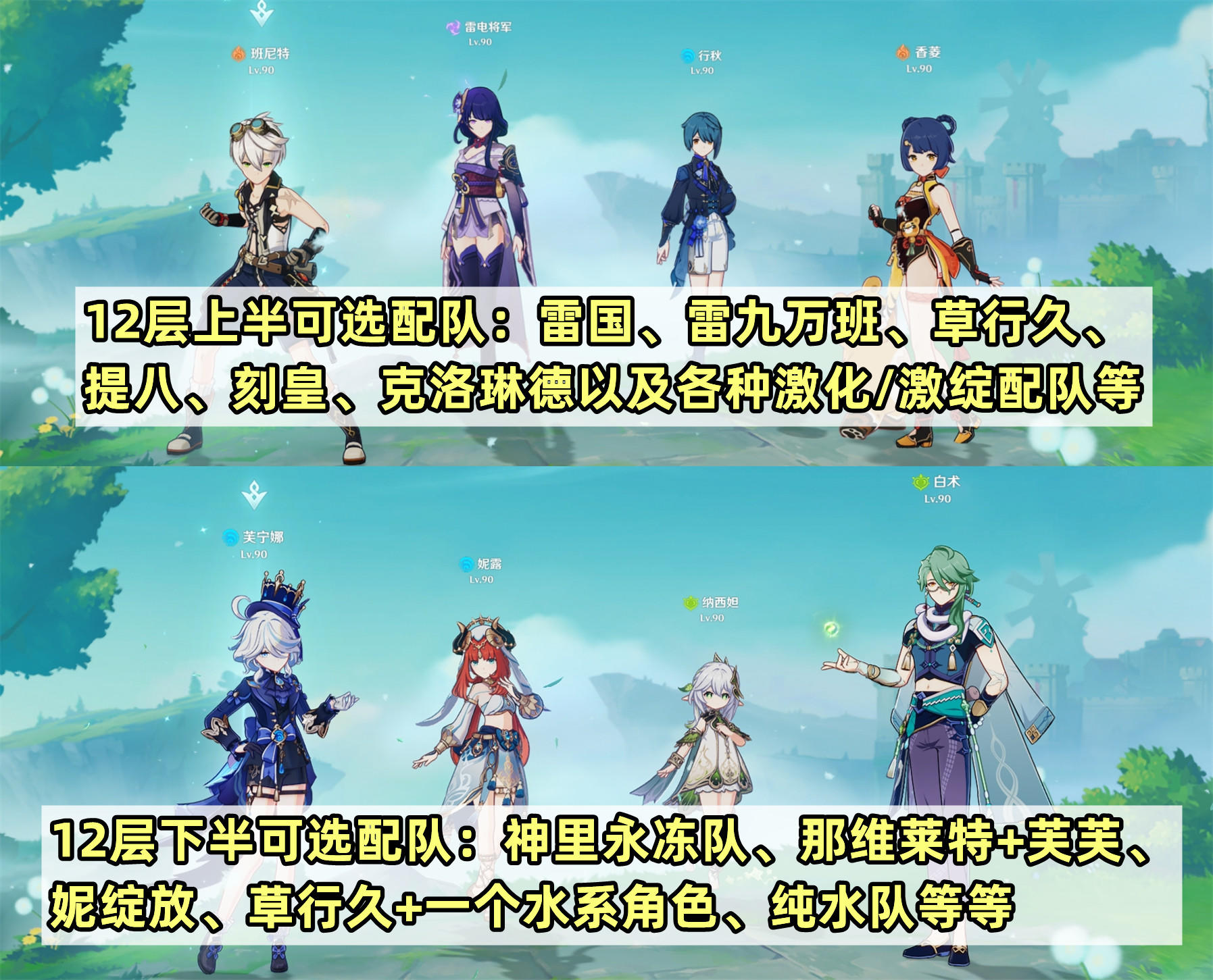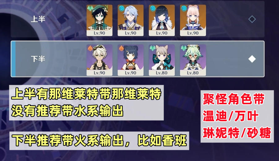 【12层队伍推荐和总结】12层上半因为有半永恒统辖矩阵,推荐带雷系角色的队伍,比如雷国、雷九万班、草行久、提八、刻皇、克洛琳德以及各种激化/激绽配队。下半需要破火盾和对群输出,推荐的队伍有神里永冻队、那维莱特+芙芙、妮绽放、草行久+一个水系角色、纯水队等等。