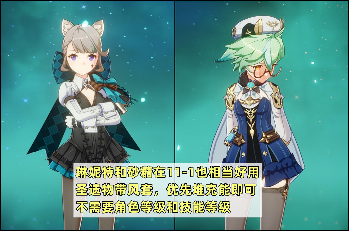 而且她俩不需要技能和角色等级,只要带上风套,以及尽可能地堆充能保证大招循环,在11-1就能发挥奇效。推荐上半琳妮特下半砂糖;又或者在上半有万叶或者温迪的情况下,琳妮特和砂糖都放在下半搭配香班。然后实战中注意大招放在左侧或者右侧,不要放在镇石的位置。只要能保证其中一路的镇石血量在90%左右,另一路容错就会高很多。