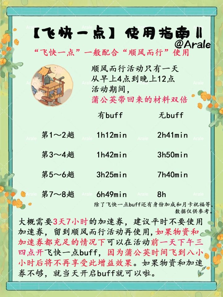 活动当天大概需要3天7小时的加速券,建议平时不要使用加速券,留到顺风而行活动再使用,如果物资和加速券都充足的情况下可以在活动前一天下午三四点开飞快一点buff,因为蒲公英时间飞到八小时后将不再享受此增益效果。如果物资和加速券不够,就当天开启buff就可以啦。