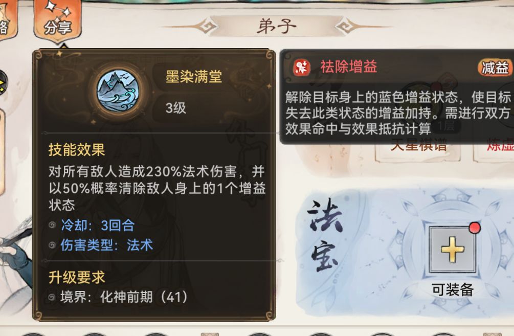 以红唐蝶衣为例子,开局100蓄力,第一回合放大荒加100蓄力,紫天命效果放技能加300蓄力(华彩加50%的蓄力速度所以是200*150%),额外在动,第一回就能施法法宝技能!这样你可以计算自己第几回合放法宝,法宝释放优先级是最高的,注意不同法宝总蓄力不一样哦,可以在弟子技能下面看蓄力值。(我要吐槽一下官方,这个看蓄力值的地方藏得是真好,我玩了一个月才知道有这么一个玩意儿)