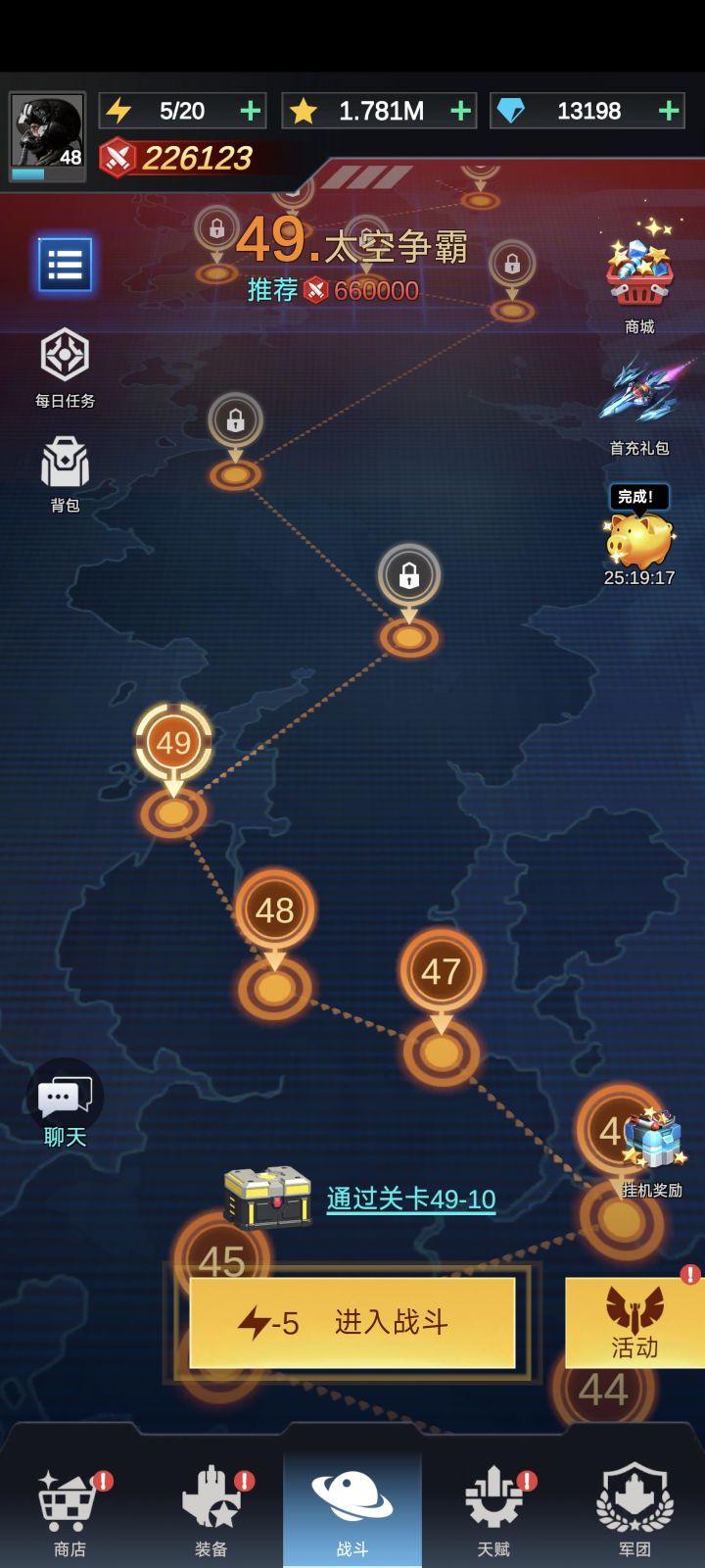 新手玩家领取七日礼包后二十关以后不太好的 技术娴熟的 可以把副炮卸下来 也可以同时把武器和护盾卸下来(技术不够的就就一个护盾)闯关过程中武器和导弹刷新率比较高 这样可以更快升满级武器 把主武器 导弹 必杀 攻击力 暴击率 攻击频率全部升满后基本就到最后一关了 以上就是新手玩家不肝不氪的基础攻略 当然玩家自身技巧也是至关重要的 如果是氪金大佬请自便
