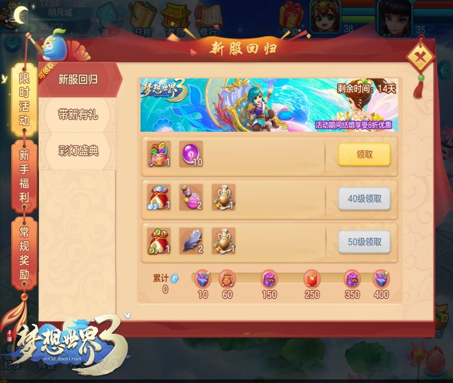 新服开服前4周开启在线礼包活动,活动期间内当天累计在线5分钟、15分钟,可各获得1份在线礼包。每天首次登录时刷新,最多领取3天奖励。