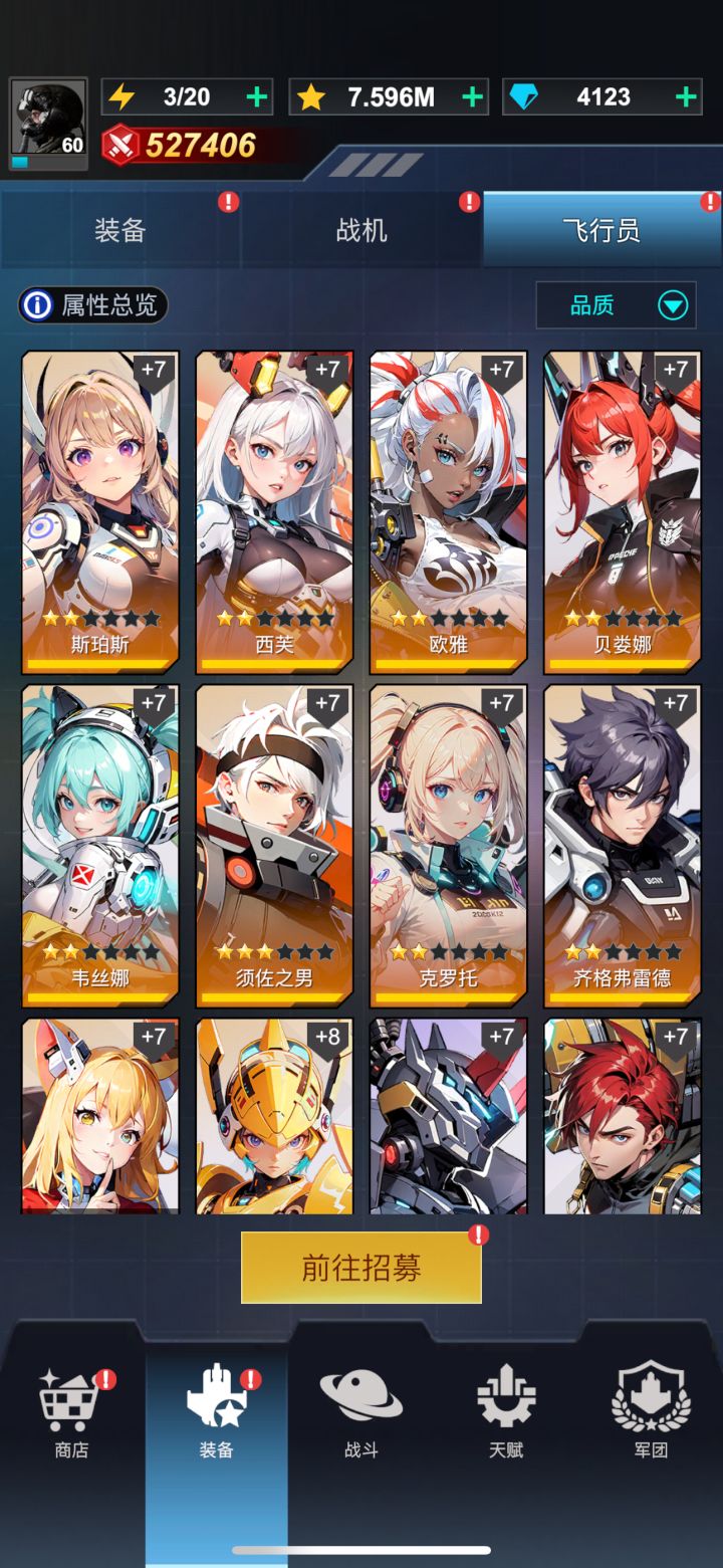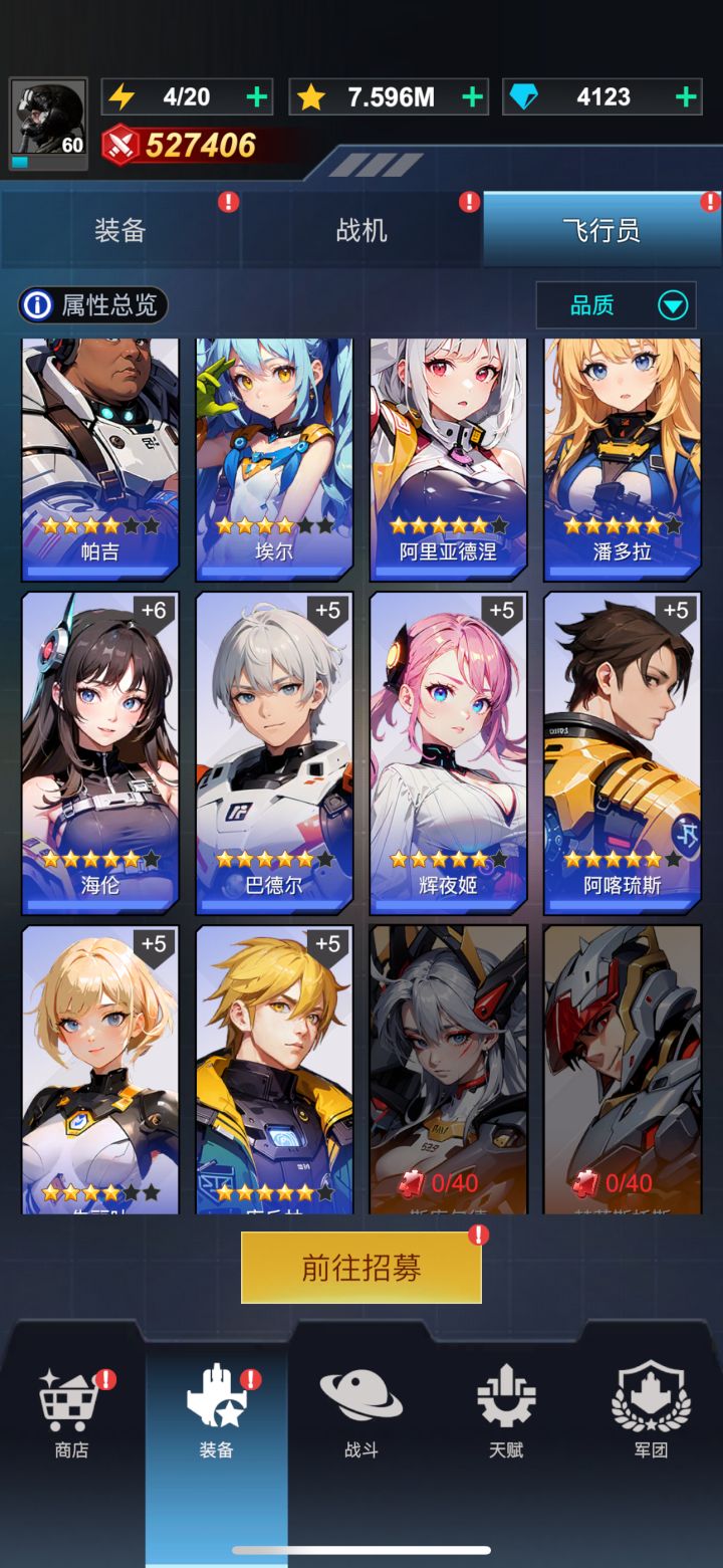 飞行员还差十多个就集满,N级飞行员5星,R、SR大多数2星,少量3星