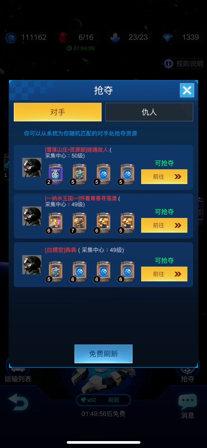 每个整点如果采集中心不够8个资源,那么他就会自动刷新一个资源,这个时候会有一定概率刷新出4钻或者与采集中心等级对应的资源,你第一时间去看就容易被你拉走,不然就会被别人抢到了。所以要整点去刷仇人的采集中心,见下文图2