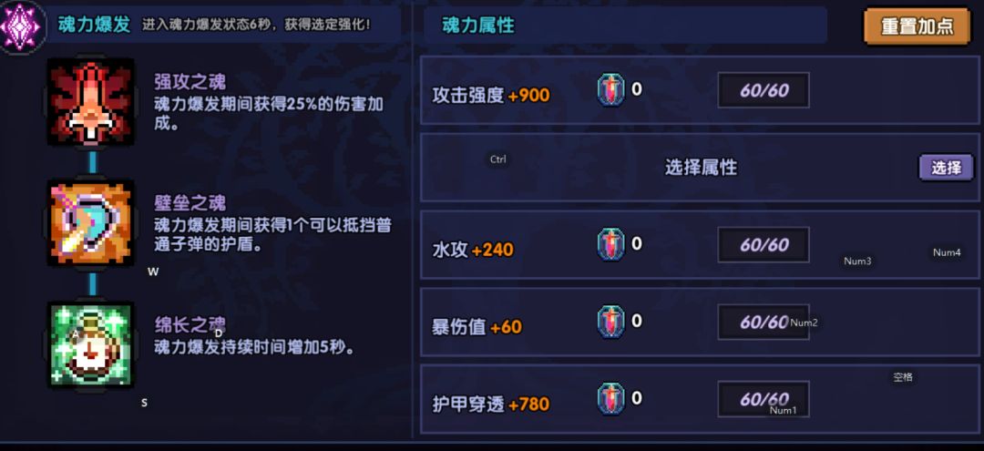 对于魂点不够用的同学,在满足穿透和暴击的前提下,各项属性平均分配点取,或者可根据自己面板来自己调整加点