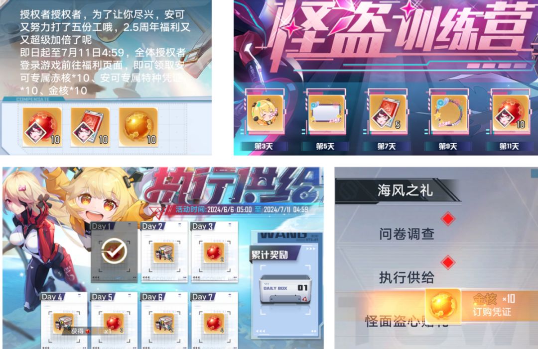 首先,是大家最关心的抽卡资源(日常运营福利+2.5周年)。为了回馈玩家,幻塔这次在2.5版本中,周年连续11天签到就能拿到限定15抽(头像框、气泡框等奖励);现在登录游戏还能直接领到20限定卡+10金核,一共是45抽;执行供给是10赤核+1000墨晶,再加上活动商店兑换的赤核,累计能超过70抽。这波福利不拿白不拿,大家记得每天一定要登录一下领取奖品哦~