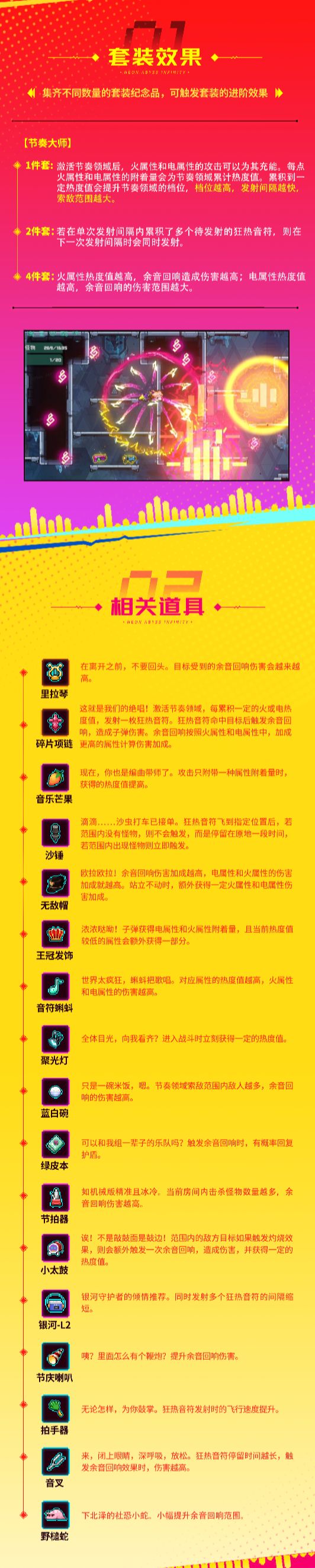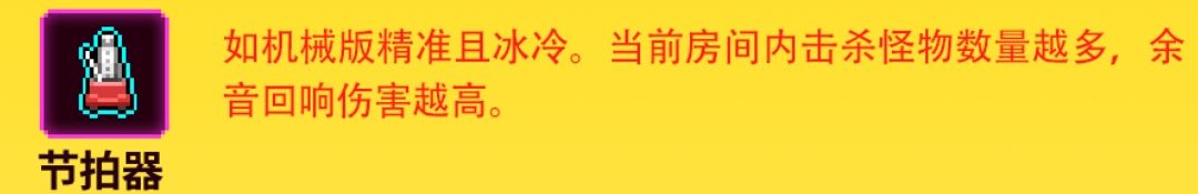 首先就是节拍器(一号位)的效果跟子弹王冠一样效果只能在一个房间里生效,到下一个房间重新叠,而同调虽说前十二波一直在一个房间能吃满效果,但开始打boss黑虎时节拍器直接报废,所以别指望用它凹分😂(除非数值跟刀二差不多,它跟遮阳伞一样是提高上限的,否则并不会太强)