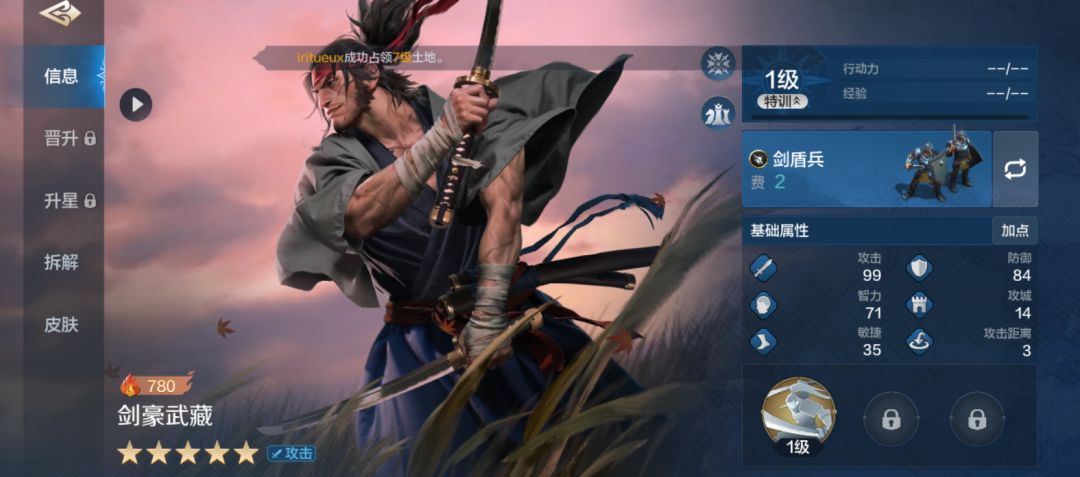 自带技能【万众一心】:每回合随机1-2名友军尝试发动伤害类主动技能失败时,有100%几率可以再尝试发动一次,且本回合造成的首次伤害提升(战时)18%(受智力属性影响)