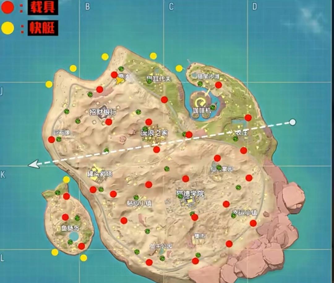 首先在上飞机之前,我们先看一下航线,这样便可以提前选择好跳点。有固定队友的话可以和队友沟通好。确定跳点时,尽量选择离航线远的地方。如果你的航线不好也没事,你也可以在岸边搜索物资,一般不会有多少人,如果有人的话就找载具跑路,在这里给大家附一张图:载具刷新点: